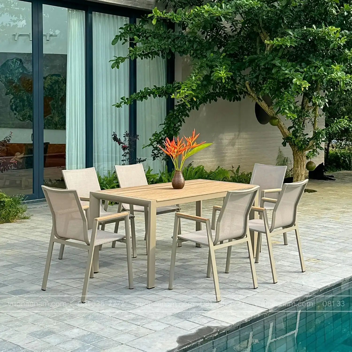 • Chất liệu ghế: Khung nhôm sơn tĩnh điện, mặt ngồi và lưng tựa lưới Textilene kháng nước, tay vịn nan gỗ Teak