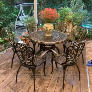 Điểm nhấn độc đáo của bộ bàn ghế này chính là hoa văn trên mặt bàn. Những họa tiết như cánh hoa được khắc họa xen kẽ, tạo thành những bông hoa tuyệt đẹp, mang đến vẻ đẹp thanh thoát và đầy nghệ thuật cho không gian ngoài trời của bạn.