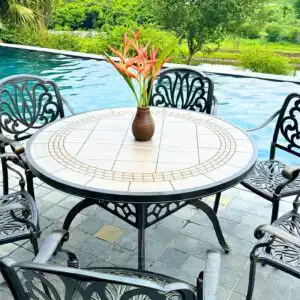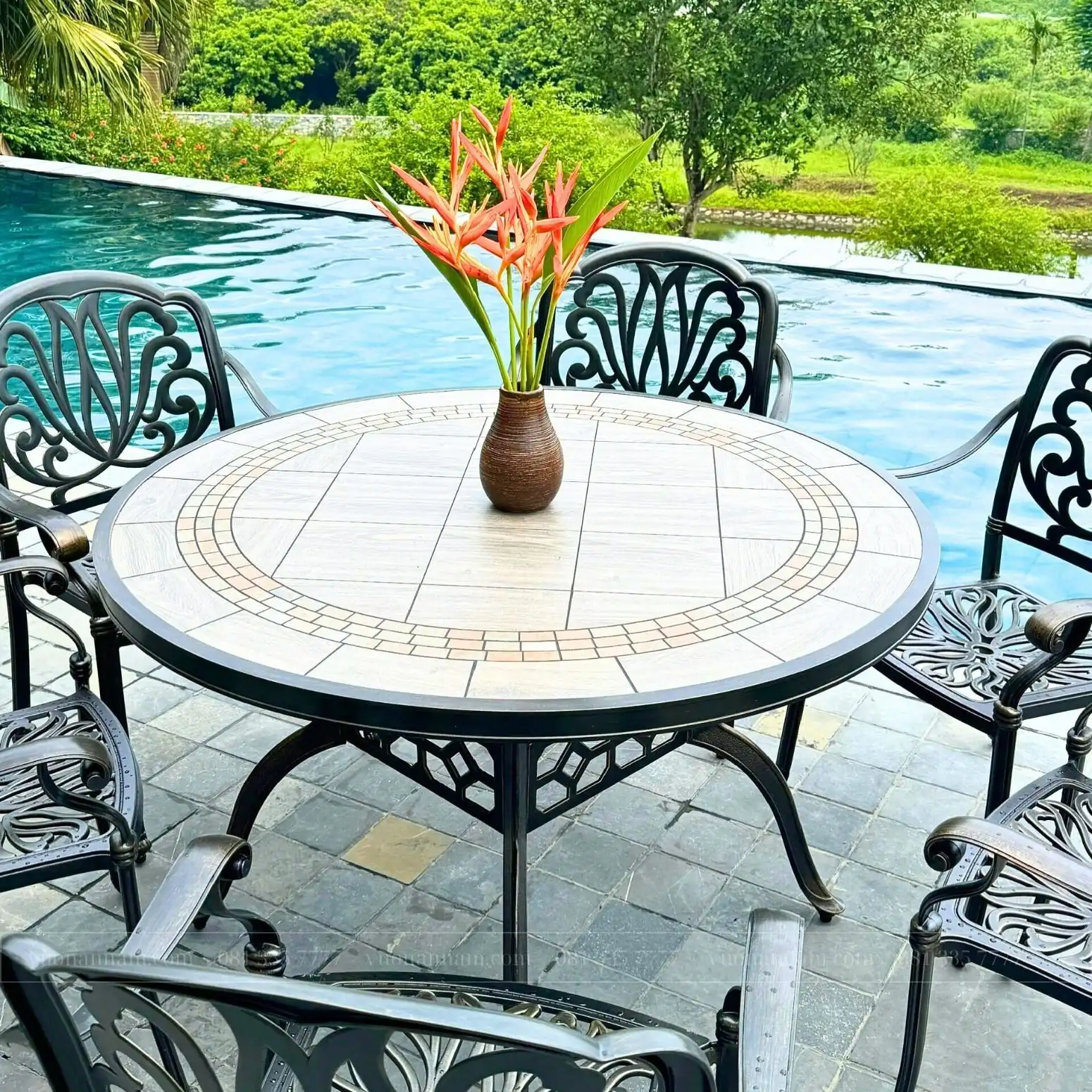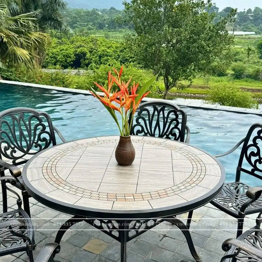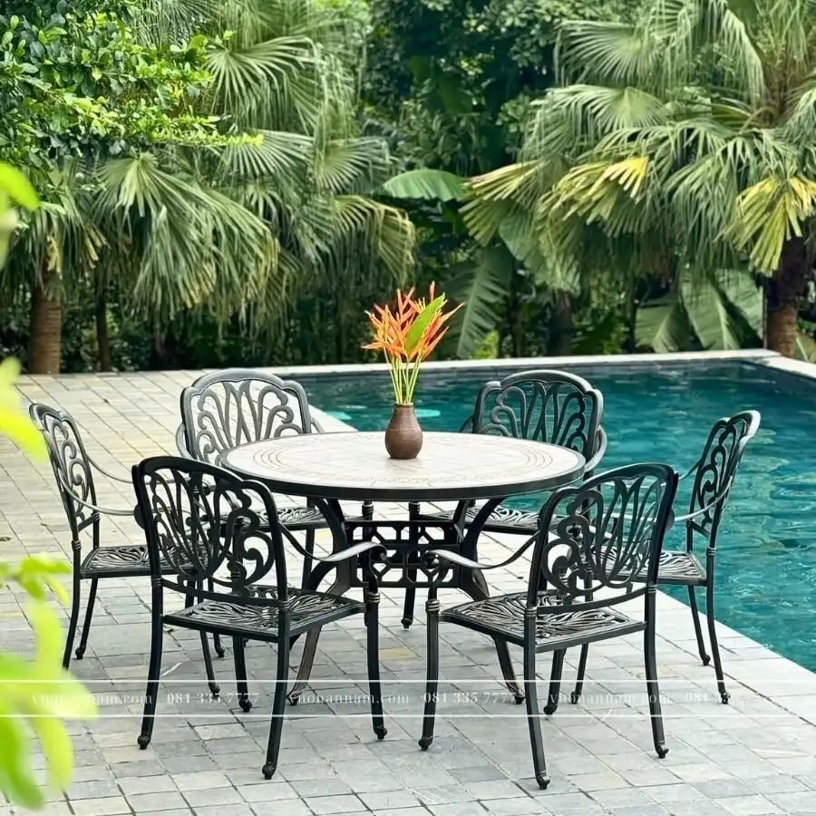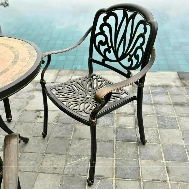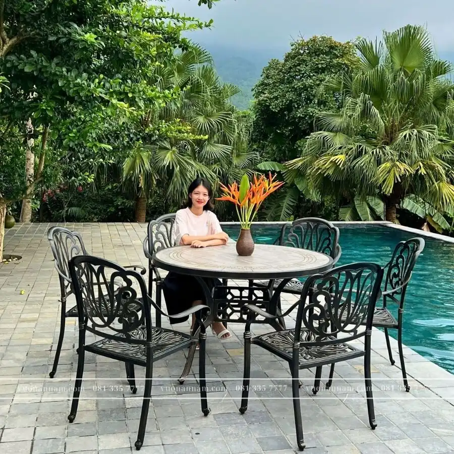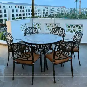 Bộ bàn ghế sân vườn cao cấp được hoàn thiện từ chất liệu nhôm đúc cao cấp dành cho không gian ngoài trời. Ngoài ra, nhôm đúc có đặc tính nổi bật là nhẹ mà bền, dễ dàng di chuyển ở mọi không gian.