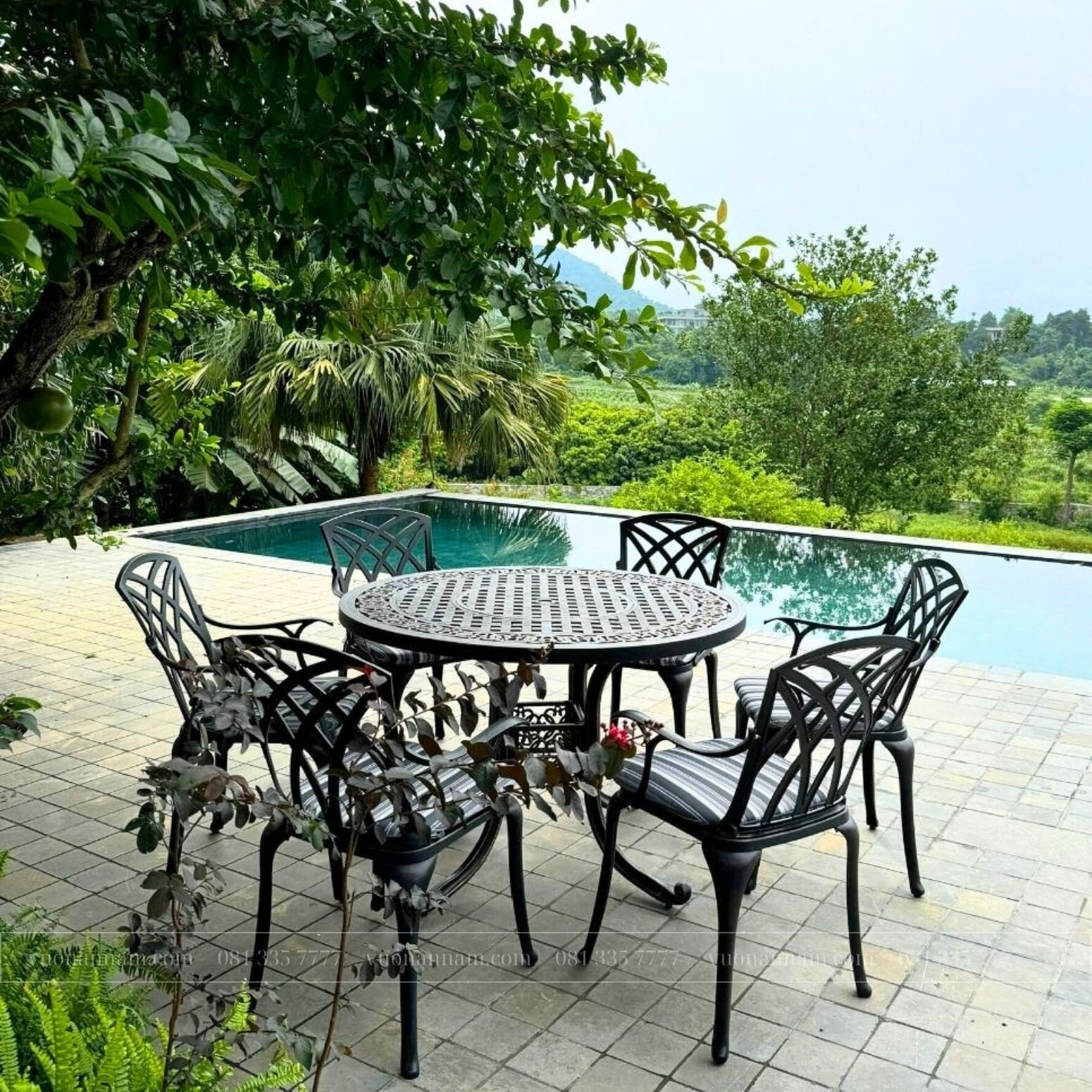 Được đồng điệu từ kiểu dáng đến màu sắc, hoa văn khắc họa tỉ mỉ giúp nổi bật không gian. Ngoài ra, chiếc ghế sở hữu kích thước mặt ngồi rộng rãi cùng tay vịn vững chắc, mặt ngồi cong nhẹ tạo cảm giác thoải mái cho người sử dụng. Mẫu bàn sân vườn có đường kính 100cm phù hợp cho những bữa ăn gia đình.