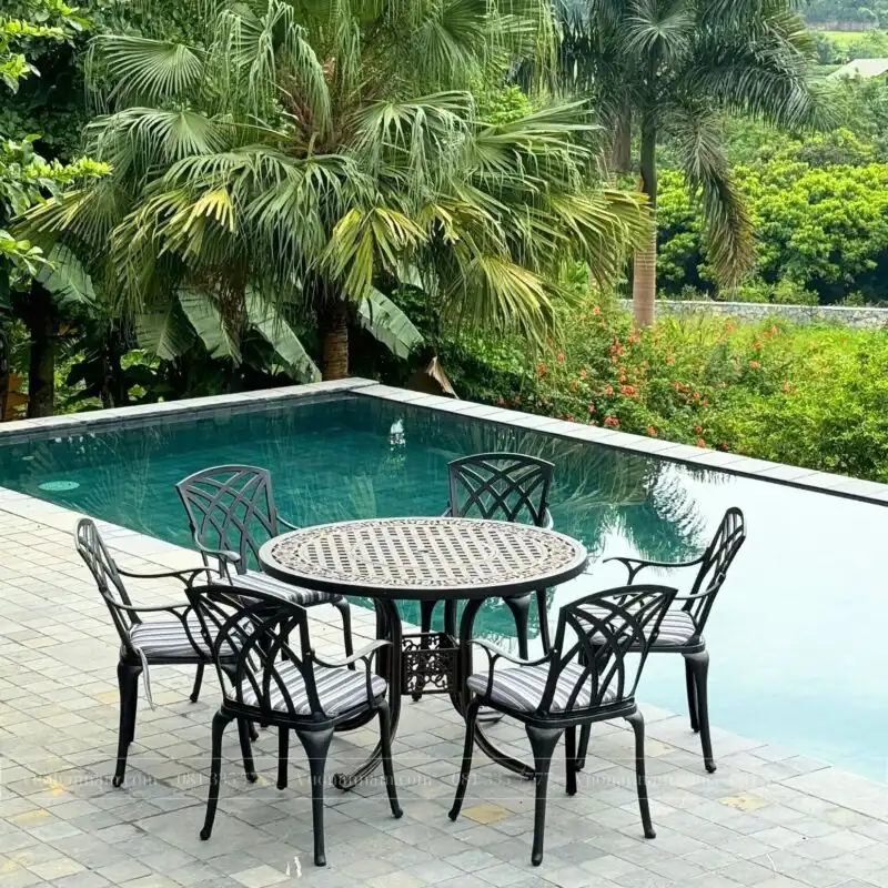 Được đồng điệu từ kiểu dáng đến màu sắc, hoa văn khắc họa tỉ mỉ giúp nổi bật không gian. Ngoài ra, chiếc ghế sở hữu kích thước mặt ngồi rộng rãi cùng tay vịn vững chắc, mặt ngồi cong nhẹ tạo cảm giác thoải mái cho người sử dụng. Mẫu bàn sân vườn có đường kính 100cm phù hợp cho những bữa ăn gia đình.