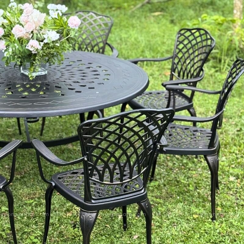 Khác với các loại vật liệu truyền thống như sắt, gỗ hay nhựa, nhôm đúc là loại vật liệu mang đến khả năng chịu lực tốt nhưng vẫn nhẹ nhàng trong việc di chuyển, bảo trì. Mỗi chi tiết trong bộ bàn ghế, từ chân bàn, mặt ngồi, tay vịn đến lưng tựa tất cả đều được đúc rời và xử lý tinh xảo, sau đó lắp ghép chắc chắn, tạo nên tổng thể kiên cố, bền bỉ và an toàn cho người dùng.