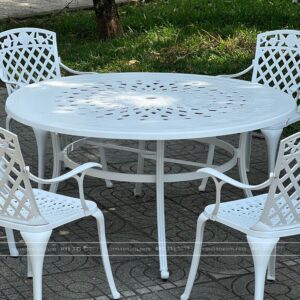 Bộ bàn ghế sân vườn màu trắng 8 ghế BG21-D150T được làm từ nhôm đúc sơn tĩnh điện cao cấp, từng chi tiết đều được đúc tách rời và hoàn thiện tỉ mỉ để tạo nên tổng thể cứng cáp, chắc chắn. Sau đó, sản phẩm được phủ lớp sơn tĩnh điện màu trắng sáng, vừa mang đến vẻ ngoài thanh thoát, vừa giúp bảo vệ bề mặt khỏi ảnh hưởng của thời tiết – từ nắng gắt, mưa nhiều cho đến không khí ẩm ướt ngoài trời.