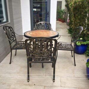Bộ bàn ghế sân vườn được làm từ những chất liệu cao cấp nhất của ngành ngoại thất. Toàn bộ ghế và khung bàn được làm từ chất liệu nhôm đúc cao cấp. Chất liệu nhôm đúc chống oxi hóa, chống mưa nắng, không bị bong tróc, phai màu sau thời gian dài sử dụng.