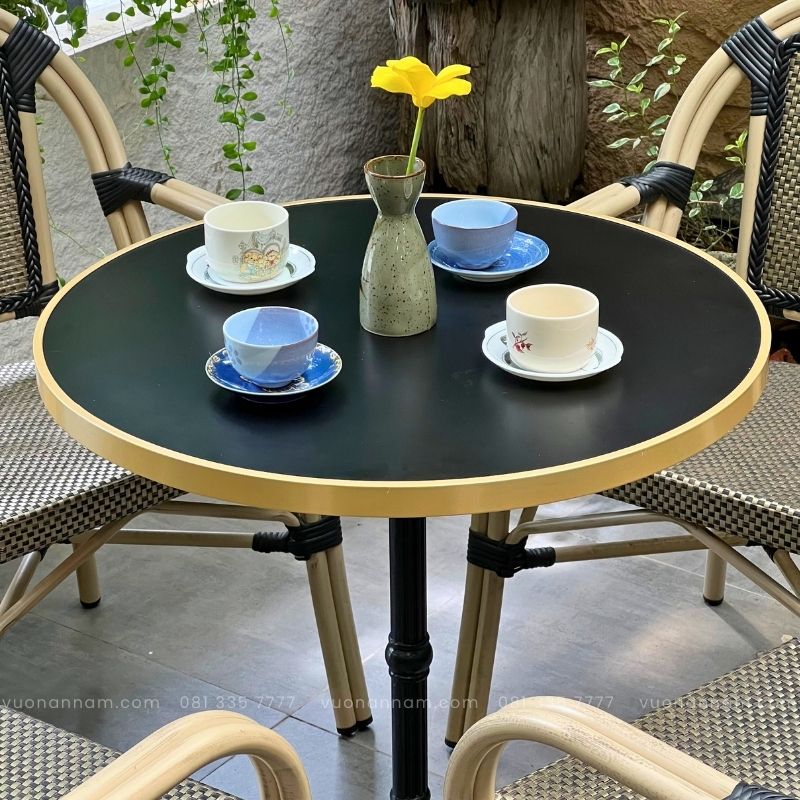 - Chất liệu bàn: Chân gang đúc, mặt bàn nhôm sơn tĩnh điện, viền bàn nhôm sơn mạ vàng.
