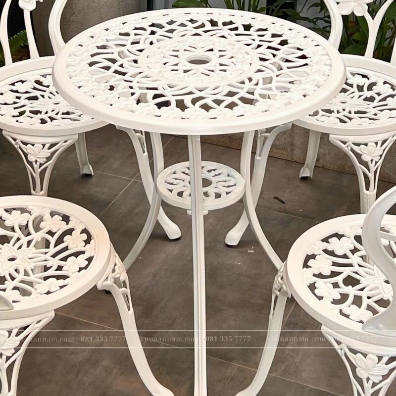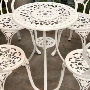Bộ bàn ghế BG-027T không bị hao mòn, gỉ sét, chịu được tác động của mọi điều kiện thời tiết nắng mưa. Ngoài ra, BG-027T được phủ lớp sơn tĩnh điện giúp sản phẩm hạn chế tối đa va đập hoặc tác động trực tiếp từ bên ngoài. Nhôm đúc là chất liệu dễ tạo hình, đúc thành những đường cong, hoa văn sắc sảo.
