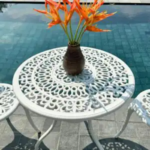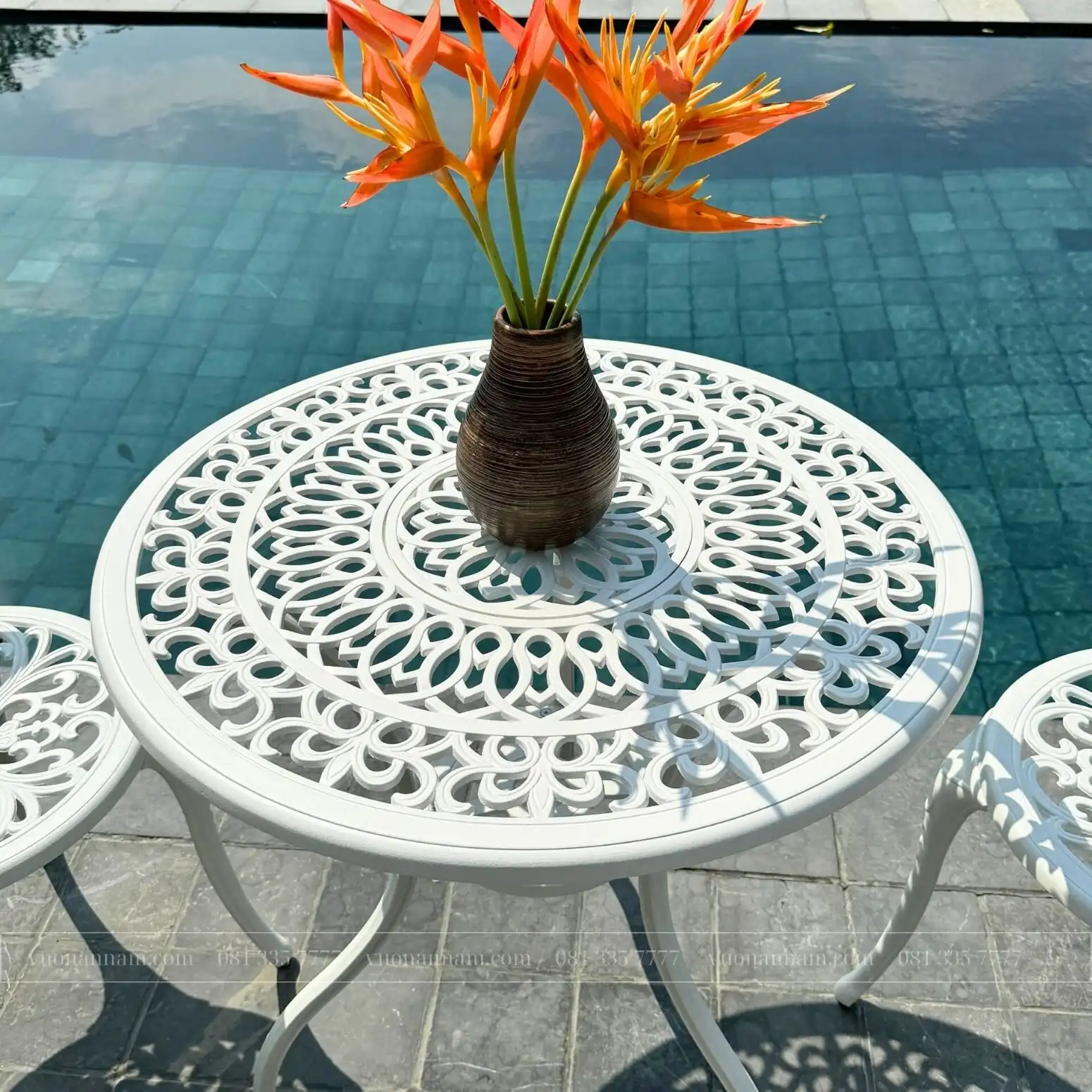 Bộ bàn ghế nhôm đúc BG-14T cánh bướm đẹp mang thiết kế nhỏ gọn có thể đặt tại ban công và sân vườn nhỏ. Bộ bàn ghế mang phong cách châu Âu hơi hướng cổ điển giúp không gian thêm nổi bật. Mặt ghế ngồi có độ trũng nhất định tạo sự thoải mái cho người sử dụng. Dù ghế không có tay vịn nhưng lại không mang cảm giác khó chịu khi ngồi.