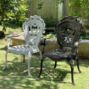 Chiếc ghế nổi bật ở các hoa văn trên phần lưng tựa, các họa tiết được khắc họa hoa văn in nổi uyển chuyển. Mặt ngồi lõm nhẹ tạo độ cong nhất định, mang lại cảm giác thoải mái khi ngồi mà không cần đệm lót. Mặt bàn đúc kín, khắc họa những hoa văn in nổi sang trọng, lạ mắt. Chân bàn đúc 4 chân, tạo sự chắc chắn, vững chãi cho mặt bàn.