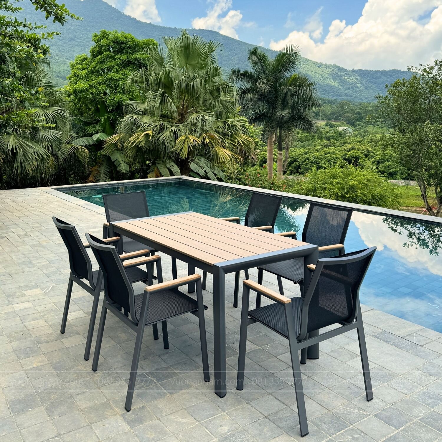Mặt bàn được làm từ nan polywood cao cấp chống thấm nước, hạn chế tối đa cong vênh, gãy vỡ khi sử dụng. Phần khung ghế sử dụng từ chất liệu nhôm đúc cùng lớp sơn tĩnh điện hạn chế tối đa trầy xước khi chịu va đập từ bên ngoài. Ngoài ra, mặt lưng ghế và mặt ngồi sử dụng lưới textilene, chất liệu bền màu, chống nước và bền bỉ.