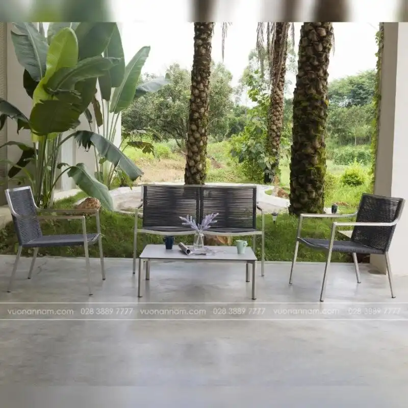 Mặt bàn vân đá và những mặt lưới dây Rope màu xám càng giúp bàn ghế có vẻ sang trọng và sạch sẽ.