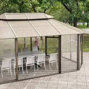 Khác với những mẫu nhà chòi bằng gỗ, tre, hay các vật liệu tự nhiên khác, nhà chòi lắp ghép bằng nhôm GZB-2 được thiết kế sang trọng giúp nổi bật không gian. Khung nhôm sơn tĩnh điện là một loại khung được làm từ hợp kim nhôm, có độ bền cao và không bị rỉ sét. Bề mặt của khung nhôm thường được sơn tĩnh điện để tăng độ bền và độ bóng của sản phẩm.