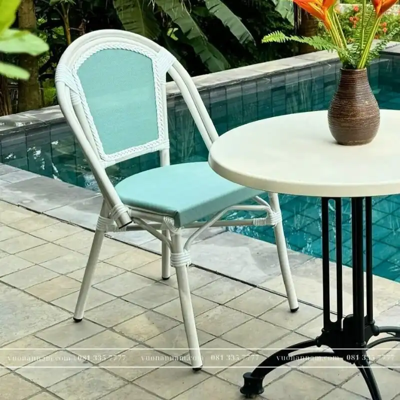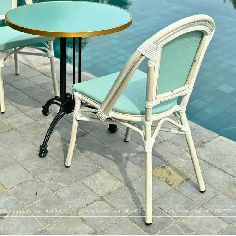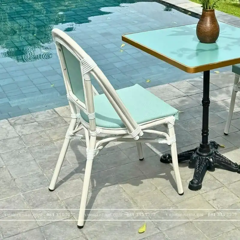 Mẫu ghế được hoàn thiện từ chất liệu khung nhôm sơn tĩnh điện cao cấp dành cho không gian ngoài trời. Khác với những mẫu ghế làm từ chất liệu nhựa, sắt, gang, nhôm là vật liệu cao cấp hơn. Những mẫu ghế được làm từ nhôm thường có độ bền cao hơn những vật liệu khác.