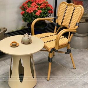 Cốt lõi của ghế cafe ngoài trời GM-03 nằm ở sự khéo léo hoàn hảo. Ghế có khung nhôm sơn tĩnh điện chắc chắn, không chỉ đảm bảo tuổi thọ mà còn mang lại vẻ ngoài hiện đại, bóng bẩy. Tuy nhiên, điều thực sự làm nên sự khác biệt của chiếc ghế này là mặt ngồi và tựa lưng của nó, được dệt tỉ mỉ bằng mây giả.