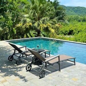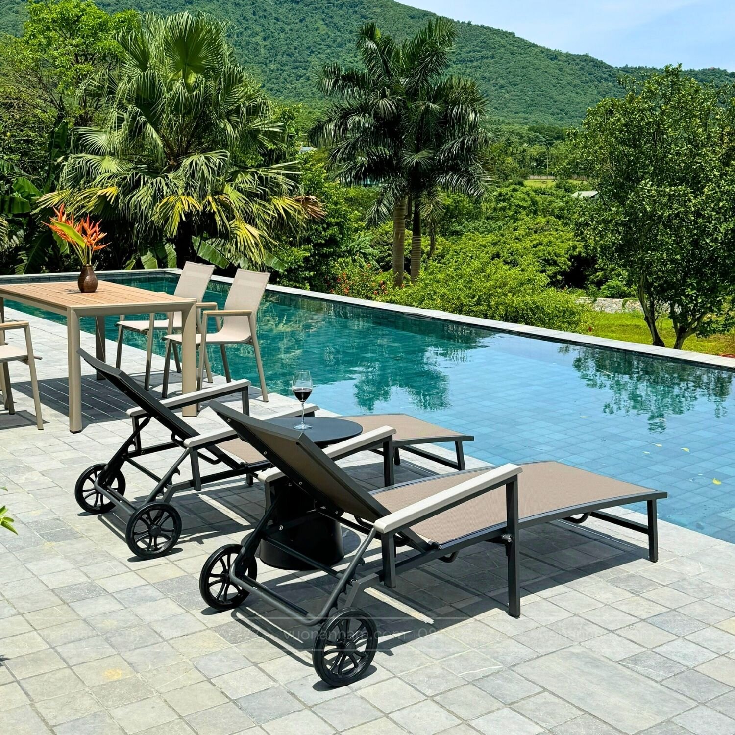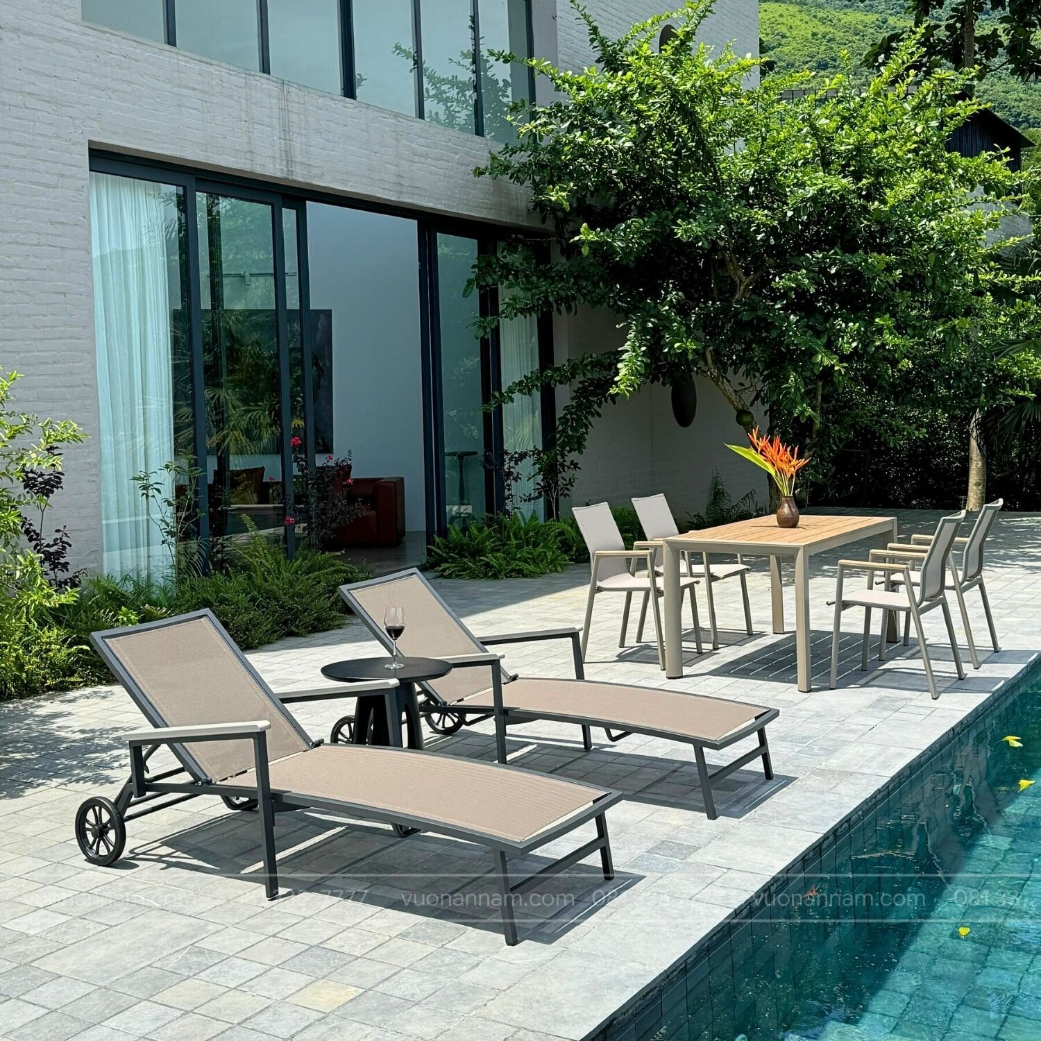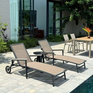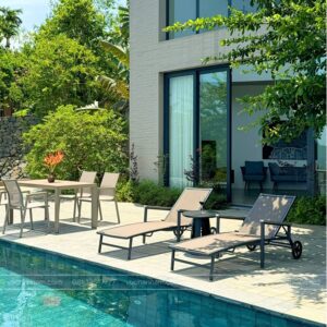 • Chất liệu: Khung nhôm sơn tĩnh điện, mặt nằm và lưng tựa lưới Textilene kháng nước, tay vịn nan Polywood