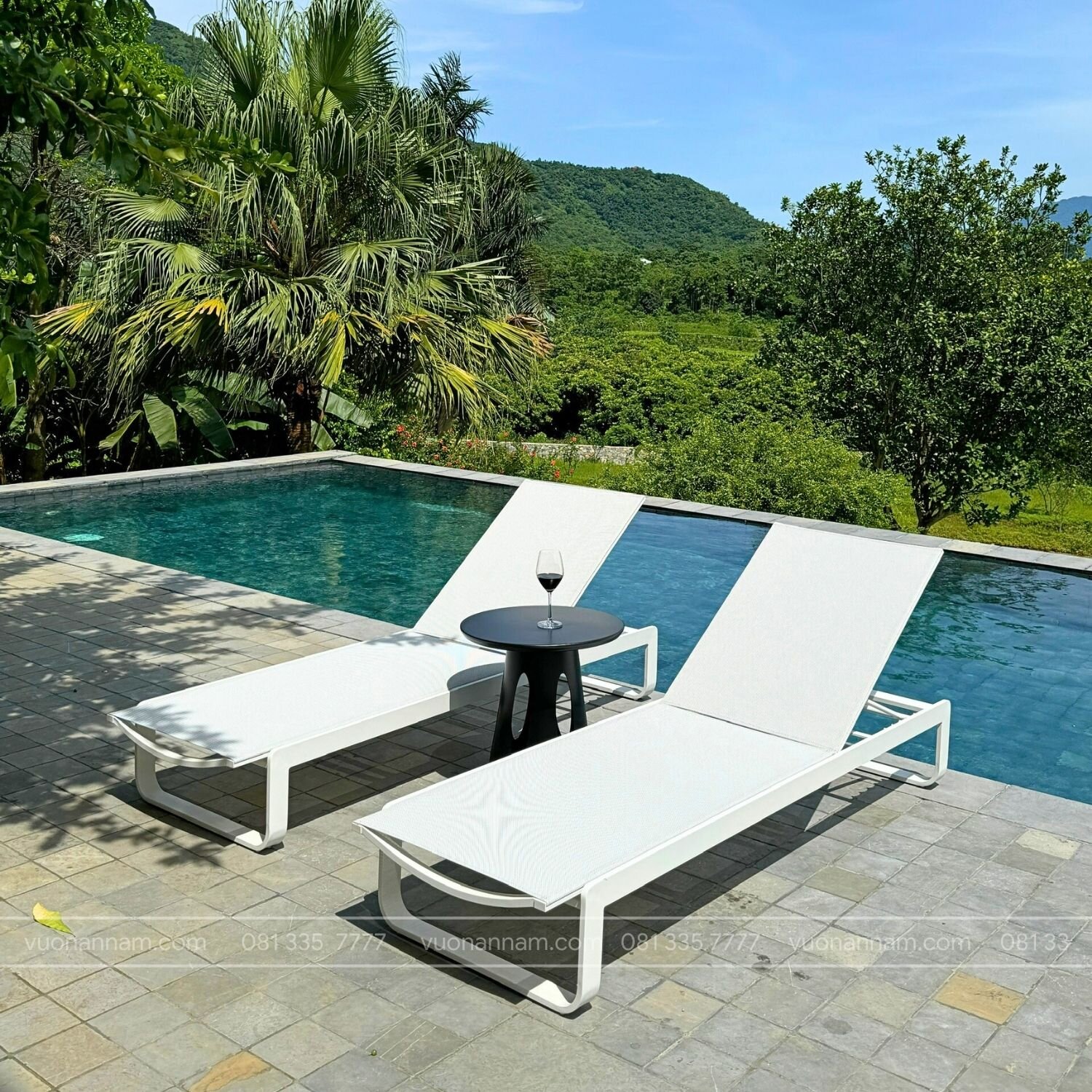 Ghế hồ bơi sang trọng với tone màu trắng tinh khôi, thanh lịch, nổi bật cho không gian. Ngoài ra, chiếc ghế có độ rộng lên đến 200cm rộng rãi, thoải mái cho người ngồi.