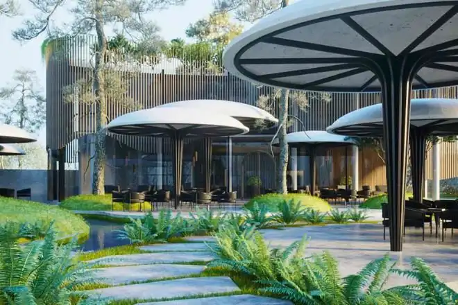 Thiết kế quán cafe sân vườn dưới tán cây là một trong những mẫu thiết kế quán cafe mang đến không gian thư giãn và gần gũi với thiên nhiên. Bằng cách tận dụng tán cây để đặt bàn ghế, sử dụng các loại cây xanh và vật liệu tự nhiên, tạo ánh sáng tự nhiên và không gian riêng tư, quán cafe sân vườn dưới tán cây mang lại cho khách hàng cảm giác thoải mái, yên tĩnh và tận hưởng không gian yên bình giữa thiên nhiên.