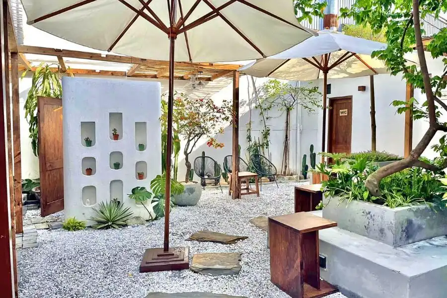 Vì vậy, cần giữ lại các loại cây xanh hiện trạng trong thiết kế quán cafe sân vườn nếu có và tận dụng chúng để làm nên những điểm nhấn đặc biệt. Cafe sân vườn với càng nhiều cây xanh sẽ tạo cảm giác thư giãn và không khí trong lành, thư thái giúp tâm trạng tốt hơn và níu chân thực khách tốt hơn. Cần trang trí mảng xanh với các loại cây lâu năm, cây lớn như bàng đài loan, osaka, xen kẽ với các loại cây bụi, cỏ trang trí tầng thấp như nguyệt quế, mai tiểu thư, cây họ ráy. Đừng quên tô điểm cho không gian xanh mát ấy với những khóm hoa, chậu hoa treo sắc màu. Một khóm hoa hồng, những chậu dạ yên thảo, mười giờ treo… vừa tạo sắc hương vừa làm không gian thêm rực rỡ. Không gian xanh trong lành, tươi mới đầy màu sắc sẽ hấp dẫn khách hàng hơn.