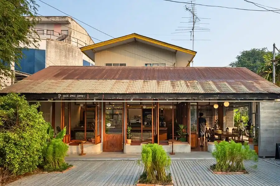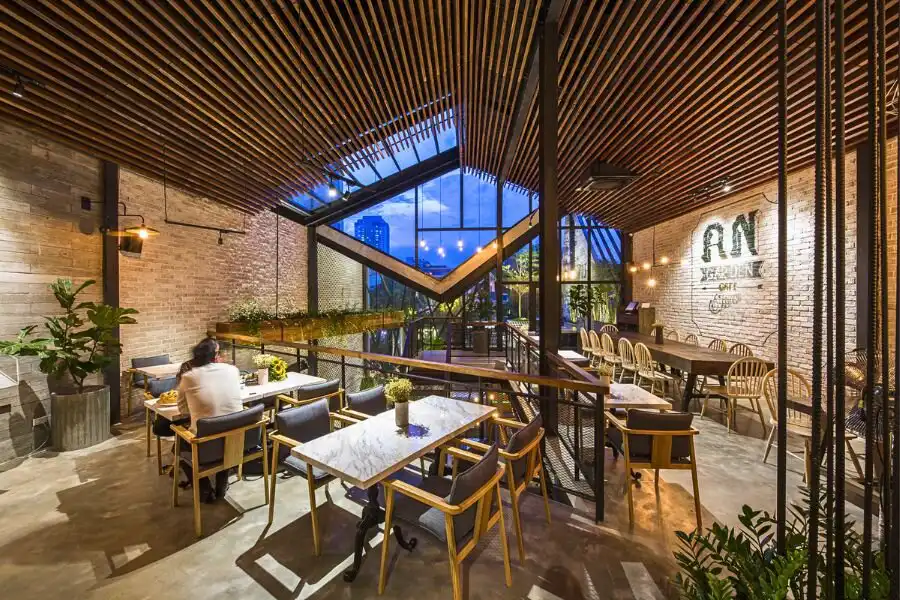 Thiết kế mở rộng tạo không gian thoáng đãng, có sự lưu thông của không khí và ánh sáng tự nhiên, là một lợi thế của quán cafe này. Tuy nhiên, để tránh khói bụi từ phương tiện giao thông, nên tránh đặt quán cafe ở những vị trí gần các trục đường lớn.