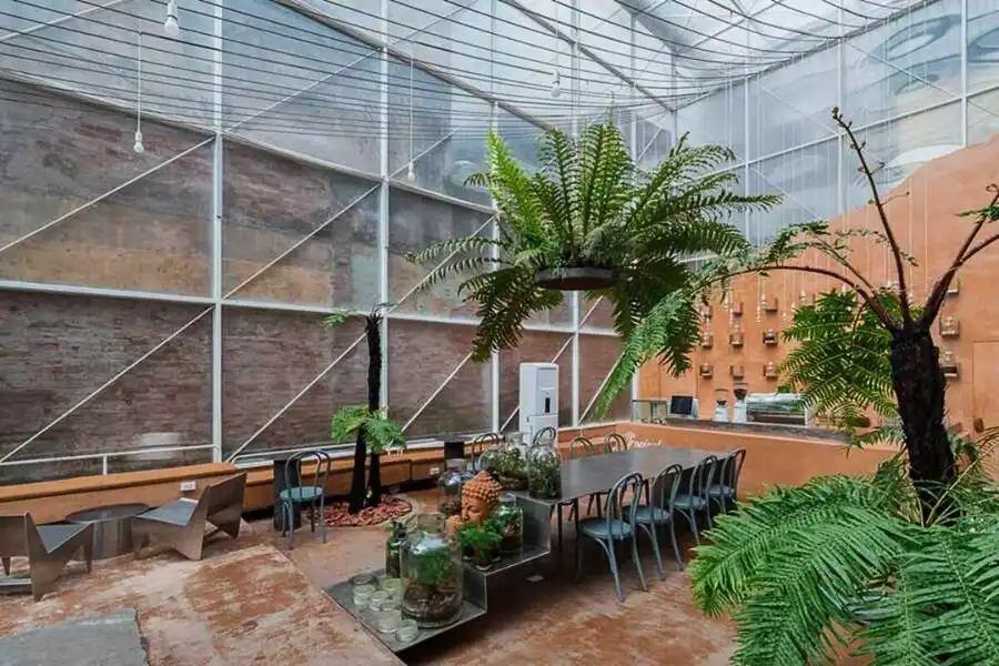 Sân vườn của quán sử dụng chủ yếu các loại cây thường xanh để tạo ra không gian xanh mát cho khách hàng. Màu xanh của quán cũng giúp khách hàng cảm thấy thư thái hơn khi bước vào, nhờ vào tường cây. Điều này đặc biệt quan trọng bởi vì ở những thành phố lớn, không gian xanh đã bị bê tông hóa.