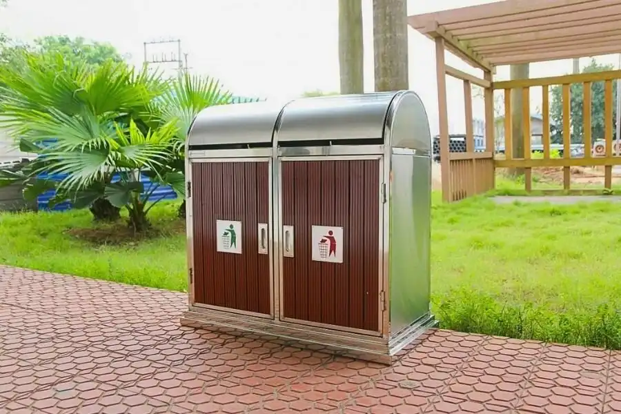 Đây là một trong các mẫu thùng rác đôi ngoài trời có nắp inox tròn, kết hợp giữa phong cách Châu Âu và Châu Á, mang đến vẻ ngoài hiện đại, sang trọng và tinh tế. Điểm đặc biệt của sản phẩm này là nắp inox tròn giúp ngăn ngừa rỉ sét và không gian xung quanh không bị ô nhiễm. Thùng rác được làm bằng gỗ và nhựa, đảm bảo an toàn cho môi trường. Bạn có thể đặt thùng rác này ở bất cứ đâu ngoài công cộng mà không cần lo lắng về hại cho môi trường.
