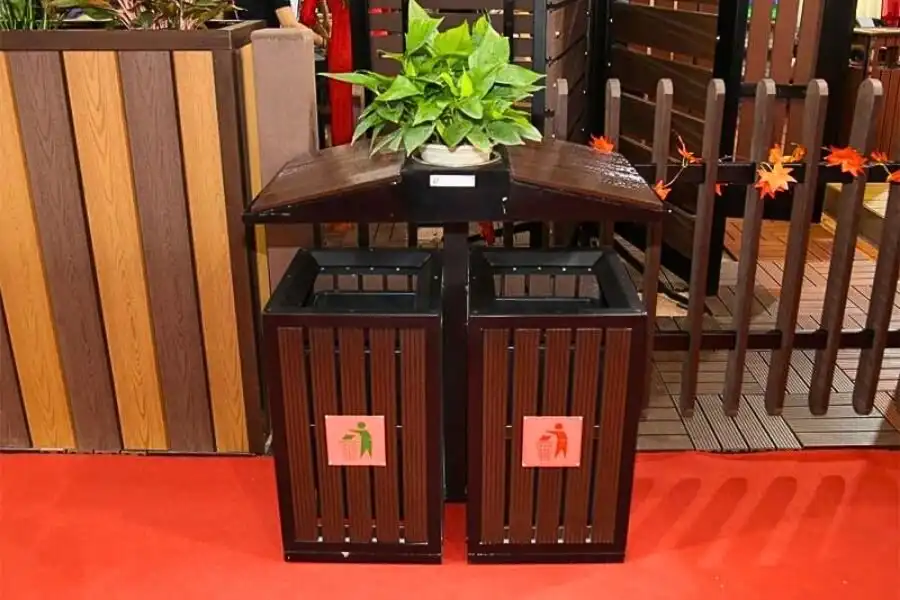Một loại thùng rác ngoài trời kép với nắp đậy được thiết kế tinh tế. Thùng rác đôi ngoài trời có nắp đậy được sản xuất từ tấm thép chất lượng cao, được sơn tĩnh điện an toàn và bộ phận ốp gỗ được làm bằng nhựa gỗ ngoài trời cao cấp WPC. Gỗ nhựa này có độ bóng, bền và dễ vệ sinh trong quá trình sử dụng.