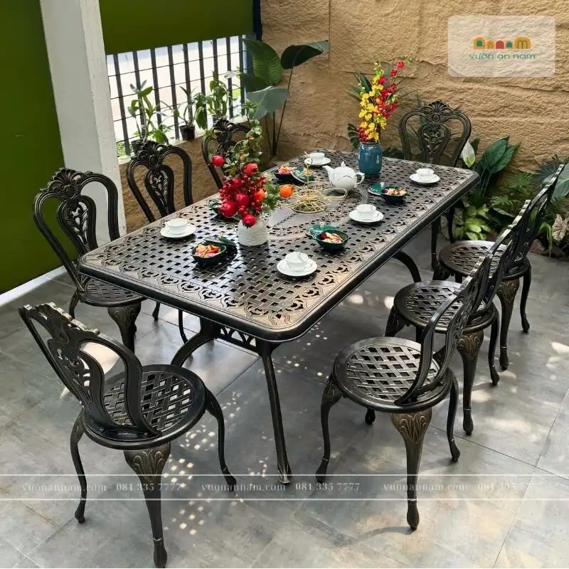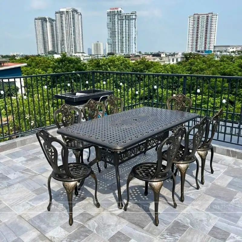 Bộ bàn ghế nhôm đúc không chỉ là một sản phẩm ngoại thất mà còn là biểu tượng của sự tinh tế và độ đẹp lạ mắt. Với 8 chiếc ghế nhôm đúc có tay vịn, mỗi chiếc ghế trở nên không chỉ thoải mái mà còn đặc biệt với hoa văn lạ mắt trên mặt lưng ghế. Hoa văn độc đáo này, như những bức tranh nghệ thuật, tạo nên điểm nhấn nổi bật, biến chiếc ghế trở thành một tác phẩm nghệ thuật.