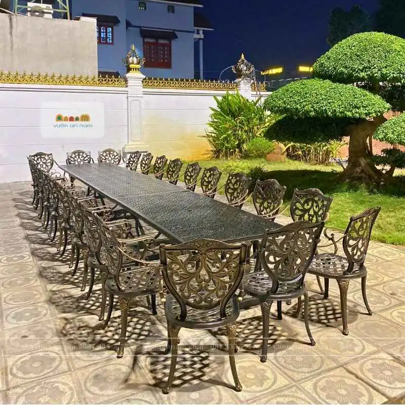 Những bộ bàn ghế lớn cho tiệc ngoài trời tại Vườn An Nam luôn được hoàn thiện từ những chất liệu cao cấp. Bộ bàn ghế lớn được cấu thành từ chất liệu nhôm đúc sơn tĩnh điện. Ngày nay, nhôm đúc được sử dụng để làm vật liệu cho các sản phẩm cho không gian ngoài trời.
