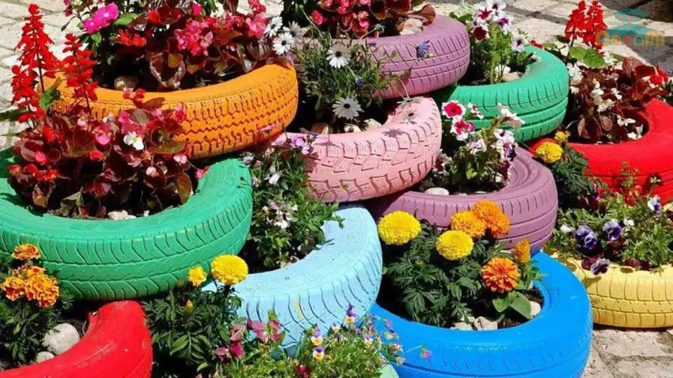 Từ lâu bánh xe cũ đã được tận dụng tái chế thành nhiều vật dụng ngộ nghĩnh đầy tính ứng dụng trong cuộc sống. Bạn có thể dễ dàng nhìn thấy những lốp xe cũ được tái chế thành những chậu hoa, vườn hoa đầy màu sắc.