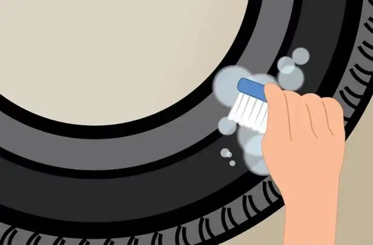 Hãy vệ sinh lốp xe bằng xà phòng hoặc chất tẩy rửa, chà sạch nó từ trong ra ngoài. Bạn cũng có thể sử dụng sản phẩm làm sạch lốp để làm sạch lốp của mình.
