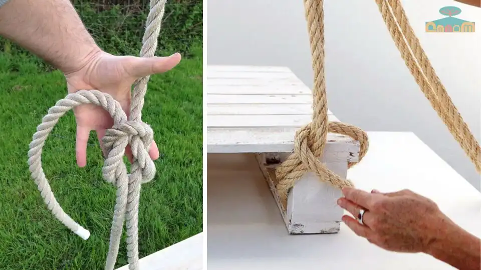 Chia 4 đoạn dây thừng chia đều vào hai bên của tấm gỗ để tạo thế cân bằng sau đó buộc dây thừng vào 4 góc của tấm pallet theo kiểu thắt slipknot hoặc là cách buộc dây thừng xích đu thông thường. Cũng có rất nhiều cách thắt dây thừng xích đu đây là hai cách dễ làm nhất mà bạn có thể bắt chước theo. Tuy nhiên sau khi buộc dây thừng xong hãy kiểm tra lại một lần nữa để chắc rằng các đầu buộc của mình thật sự đã chắc chắn để không có bất kì tình huống đáng tiếc nào trong suốt quá trình sử dụng.
